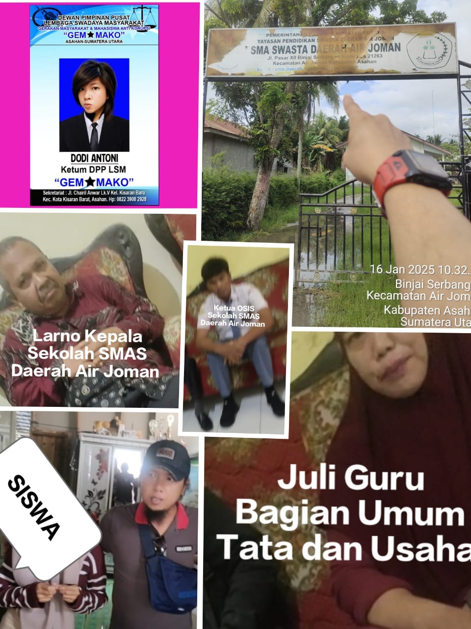 Terpisah, Dodi Antoni Ketua Umum Dewan Pimpinan Pusat Lembaga Swadaya Masyarakat Gerakan Masyarakat dan Mahasiswa Anti Korupsi Kabupaten Asahan Provinsi Sumatera Utara Republik Indonesia (KETUM DPP LSM GEMMAKO ASAHAN SUMUT RI) Menyampaikan, Mohon ijin melaporkan kepada Bapak Presiden Republik Indonesia Prabowo Subianto yang terhormat, sungguh sangat mengerikan pada hasil investigasi kami dalam penyelidikan dana bantuan KIP di Sekolah SMAS Daerah Air Joman, landasan atau dasar 10 poin diatas tidak ada dalam peraturan dan undang undang.