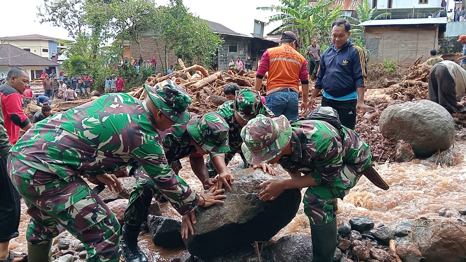 Danramil 05/Reban Lettu Arh M. Ikhsan mengatakan, pihaknya mengerahkan personilnya untuk membantu warga membersihkan material yang terbawa banjir bandang menutupi jalan dan mengganggu aktivitas warga.