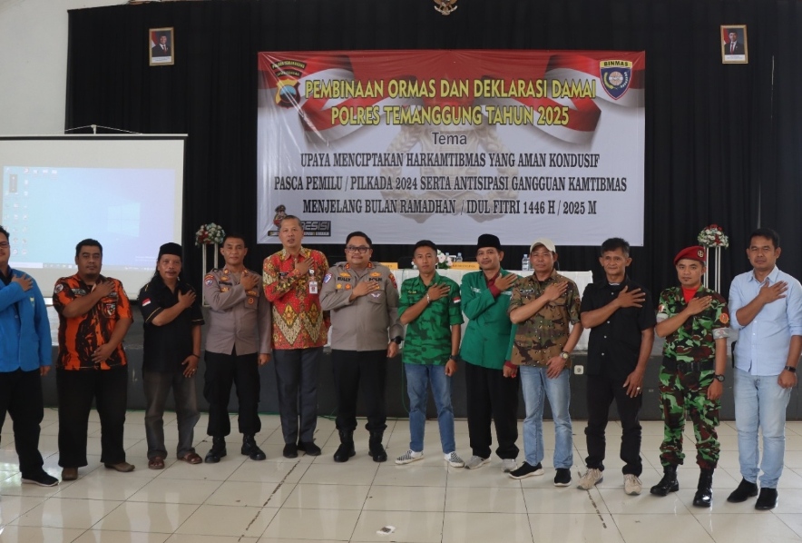 JST-NEWS.COM |TEMANGGUNG – Polres Temanggung, Polda Jateng menggelar acara pembinaan organisasi masyarakat (ormas) dan deklarasi damai tahun 2025 di Omah Kebon pada Selasa, 25 Februari 2025. Acara ini dihadiri oleh perwakilan berbagai ormas di wilayah Kabupaten Temanggung, tokoh masyarakat, serta pejabat dari Polres Temanggung dan Pemerintah Kabupaten Temanggung.