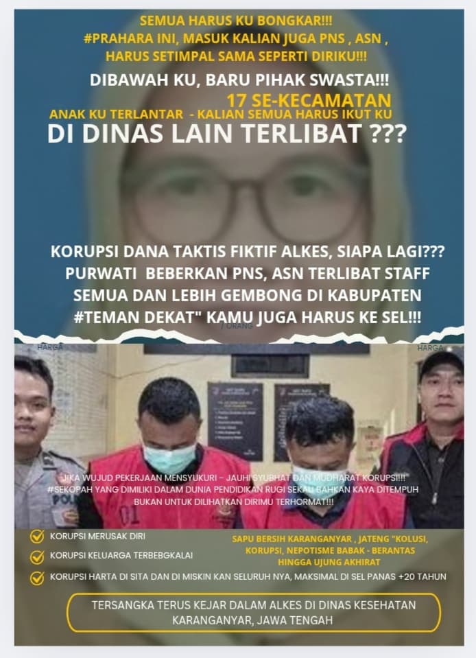 JST-NEWS.COM – Karanganyar Ada Apa Sich??? “Kasus Korupsi Taktis beberapa hari sudah fakta & jelas ALKES – Babak BARU : Purwati sebagai satu Kepala Dinas Kesehatan KAMI AKAN SEMUA MEMBONGKAR STAFF, DINAS LAIN di Kabupaten Karanganyar. harta bisa pamit hidup anak-anak pun ikut terlantar seorang kasih ibu tertumpuh asa dibalik jeruji SEL, inilah kisah sebuah misteri kehidupan dunia dalam musuh terdepan nya manusia yang menasehati atau memberikan masukan baik dan benar.(29/5/2025)