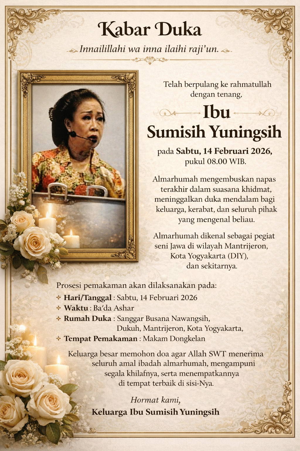 Demikian kabar duka ini disampaikan. Atas doa, perhatian, dan kehadiran Bapak/Ibu/Saudara(i), keluarga menyampaikan terima kasih yang sebesar-besarnya.