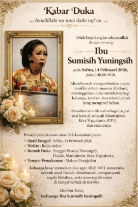 YOGYAKARTA Kabar Duka Idza Ashobathum Musibah Qolu’; Innalillahi wa inna ilaihi raji’un. Telah berpulang ke rahmatullah dengan tenang, Ibu Sumisih Yuningsih, pada Sabtu, 14 Februari 2026, pukul 08.00 WIB. Almarhumah…